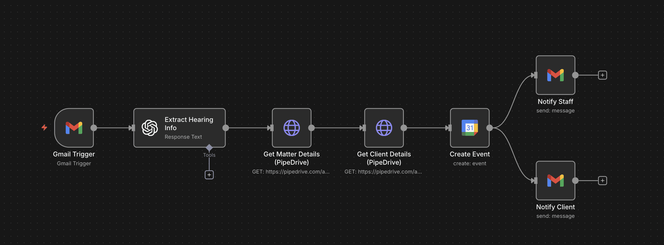 Gmail Node (Client): Your client receives a professional confirmation email. This is also a great opportunity to attach any documents they should have before the hearing.